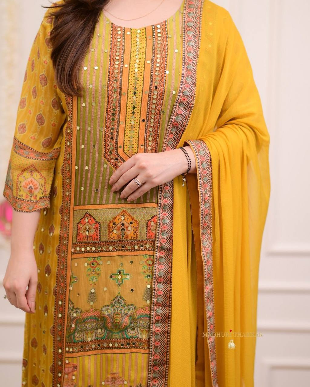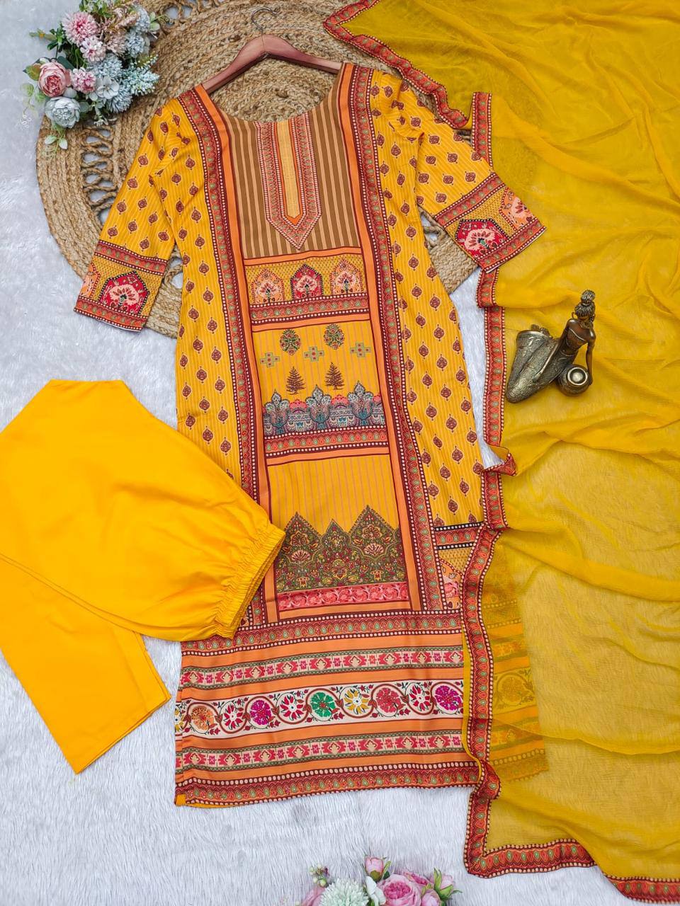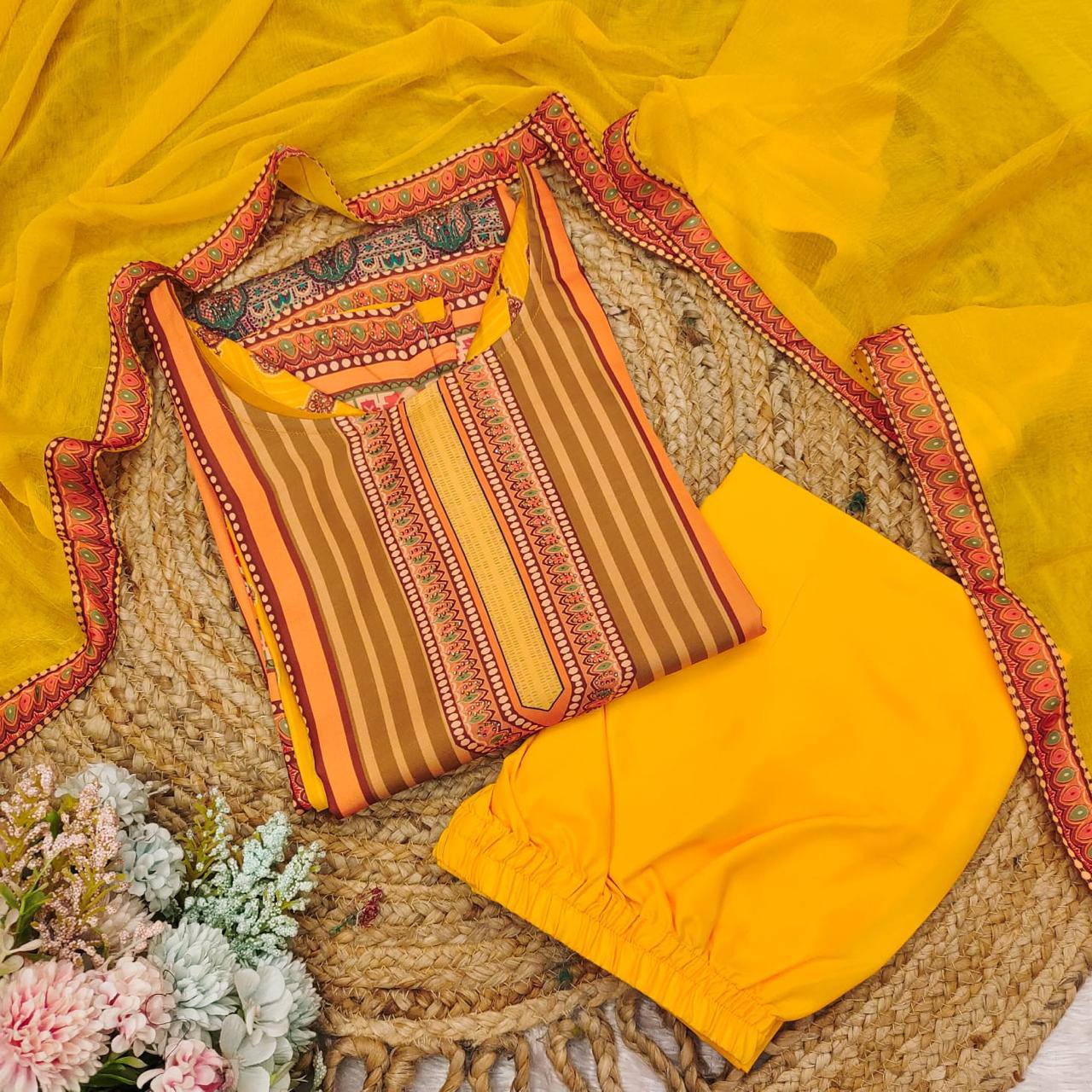 Yellow Satin Silk Digital Print Salwar Suit Set* *the shows patterns that strongly resemble stone embellishments, it’s most likely a clever digital print technique that creates the illusion of stonework. This is done to provide the rich look of embellishments